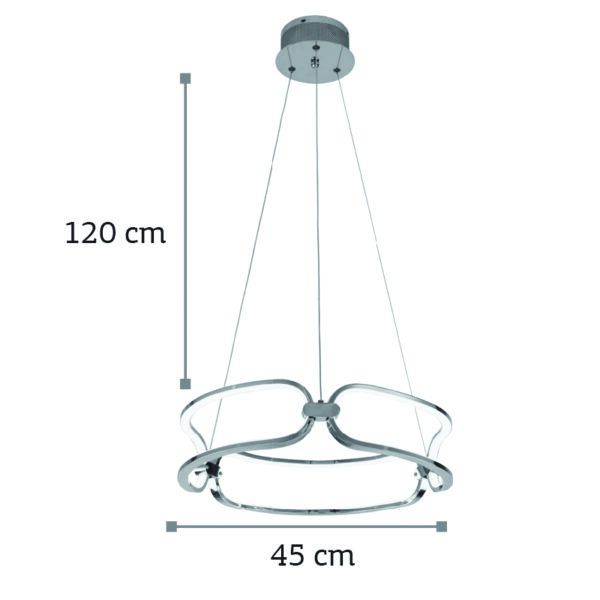 Πρόκειται για ένα χρώμιο κρεμαστό φωτιστικό κατασκευασμένο από αλουμίνιο. Στο εσωτερικό του υπάρχει λευκή ακρυλική επιφάνεια που καλύπτει τον led