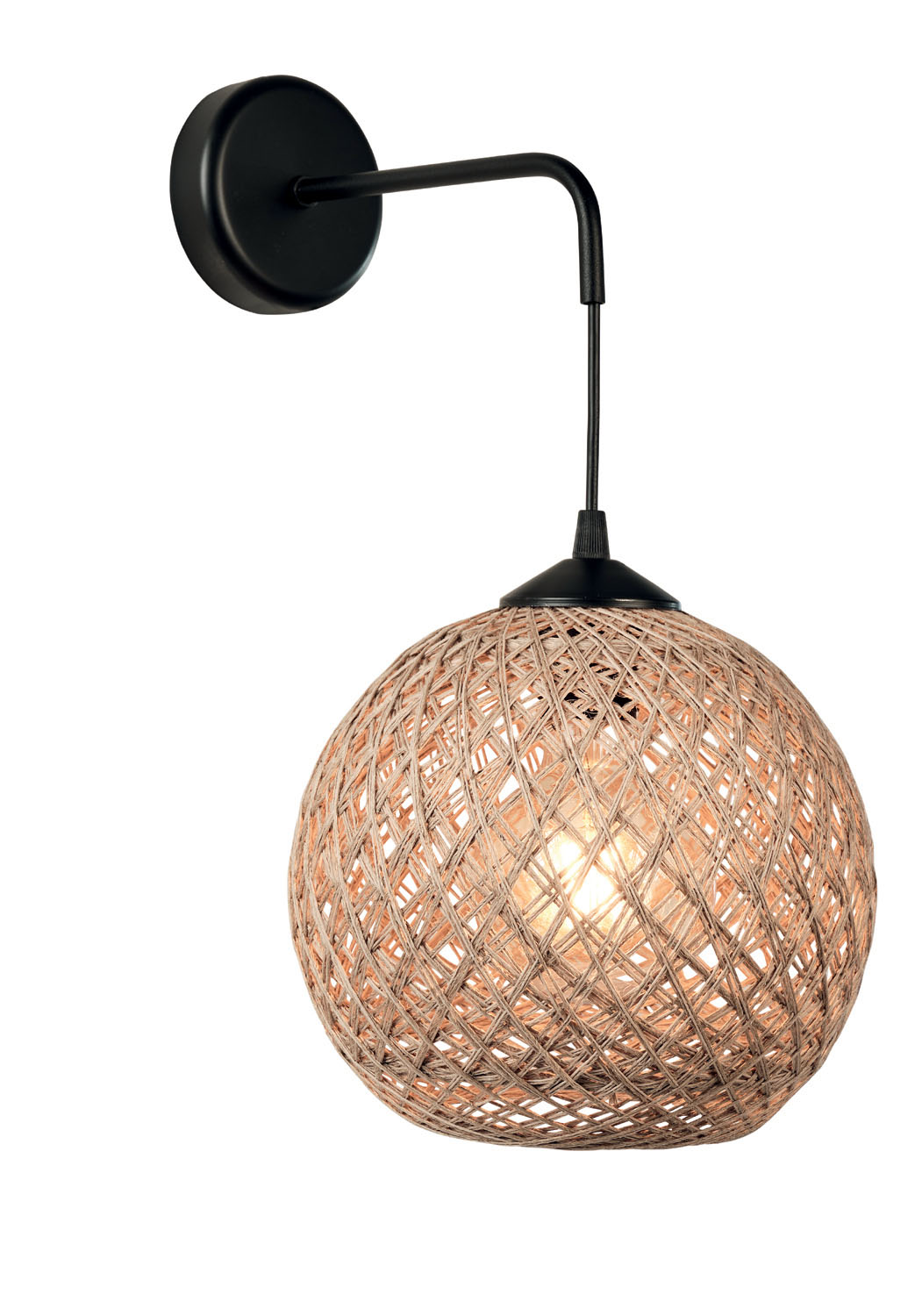 Φωτιστικό Απλίκα Ε27 σε μοντέρνα γραμμή με μπάλα σχοινί σε φυσικό χρώμα και μεταλλικά μέρη σε μαύρο