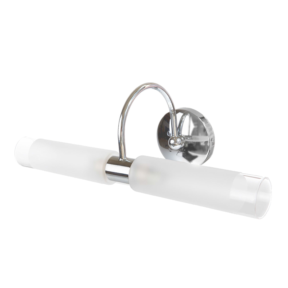 Πρόκειται για ένα επιτοίχιο φωτιστικό κατασκευασμένο από μέταλλο σε χρώμιο απόχρωση με δύο λαμπτήρες που καλύπτονται από κυλινδρικό γυαλί αμμοβολής με διάφανες λεπτομέρειες. Είναι η ιδανική επιλογή για φωτισμό μπάνιου τοποθετημένο πάνω από τον καθρέπτη αφού το φως διαχέεται ομοιόμορφα.