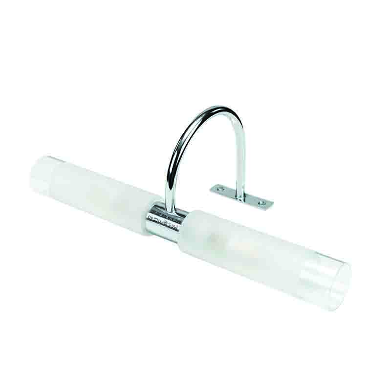 Πρόκειται για ένα επιτοίχιο φωτιστικό κατασκευασμένο από μέταλλο σε χρώμιο απόχρωση με δύο λαμπτήρες που καλύπτονται από κυλινδρικό γυαλί αμμοβολής με διάφανες λεπτομέρειες. Είναι η ιδανική επιλογή για φωτισμό μπάνιου τοποθετημένο πάνω από τον καθρέπτη και όταν υπάρχει έλλειψη χώρου για την βάση του. Το φως διαχέεται ομοιόμορφα.