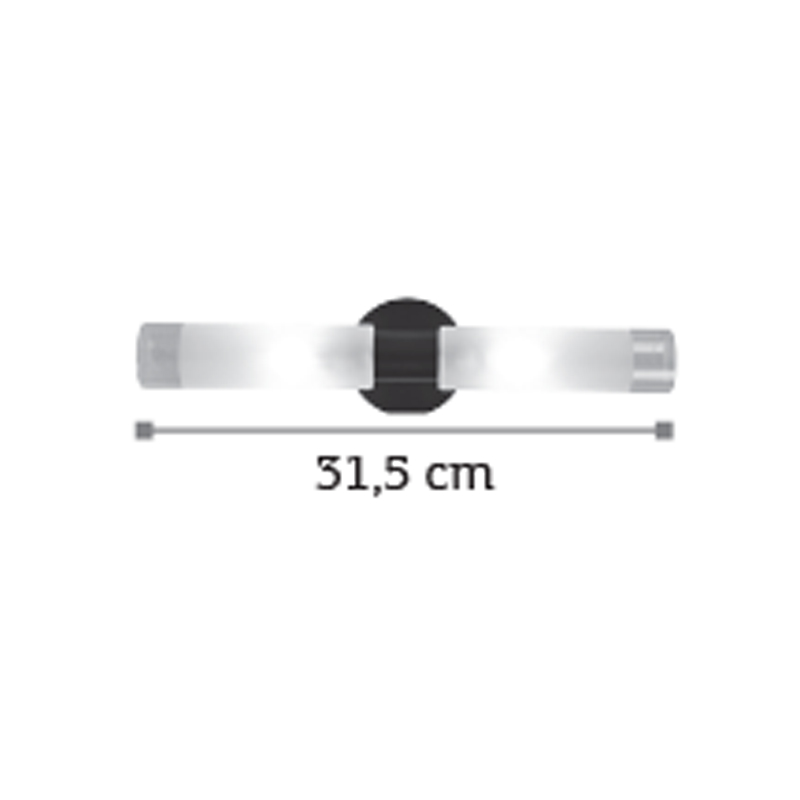 Πρόκειται για ένα επιτοίχιο φωτιστικό κατασκευασμένο από μέταλλο σε μαύρη απόχρωση με δύο λαμπτήρες που καλύπτονται από κυλινδρικό γυαλί αμμοβολής με διάφανες λεπτομέρειες. Είναι η ιδανική επιλογή για φωτισμό μπάνιου τοποθετημένο πάνω από τον καθρέπτη αφού το φως διαχέεται ομοιόμορφα.