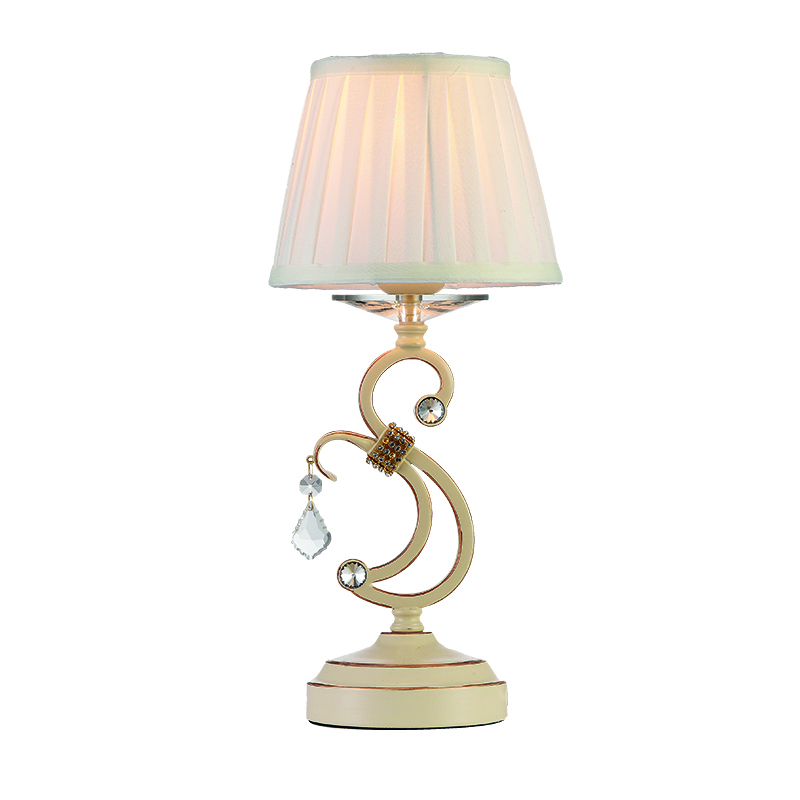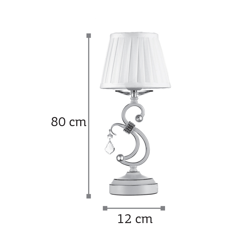 Πρόκειται για ένα μπεζ μεταλλικό επιτραπέζιο φωτιστικό με διακριτική ύπαρξη κρυστάλλων. Το μπεζ υφασμάτινο καπέλο δίνει έναν απαλό φωτισμό στον χώρο.