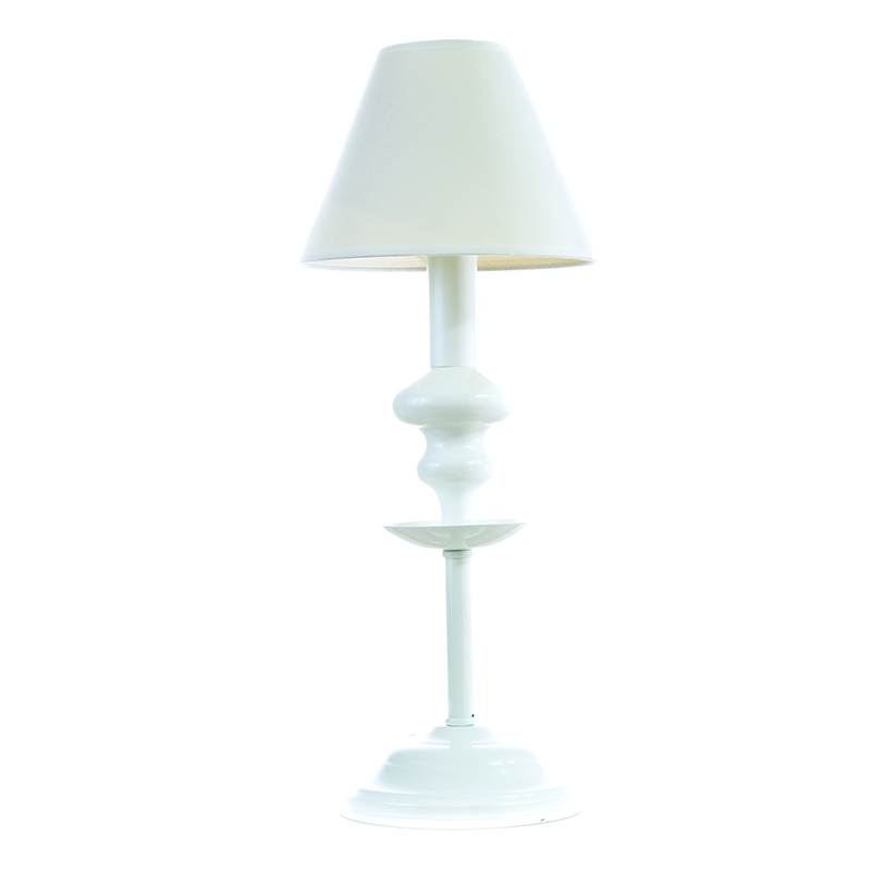 Πρόκειται για ένα λευκό μεταλλικό επιτραπέζιο φωτιστικό με ιδιαίτερη σχεδίαση. Το λευκό υφασμάτινο καπέλο το συμπληρώνει δίνοντας έναν πιο ατμοσφαιρικό φωτισμό στον χώρο.