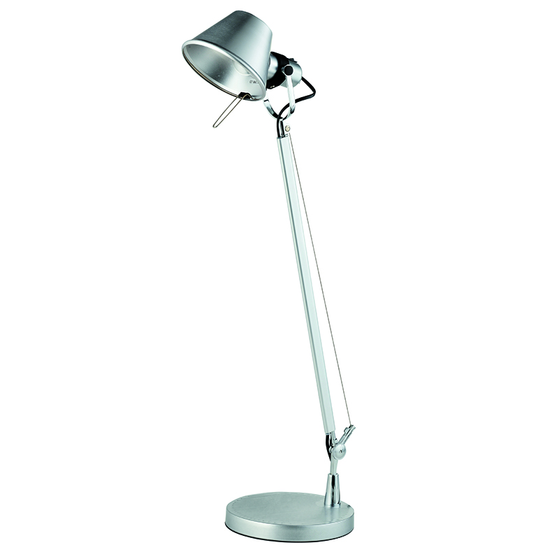 Πρόκειται για ένα μεταλλικό επιτραπέζιο φωτιστικό σε ασημί απόχρωση. Οι χρώμιο λεπτομέρειες του δίνουν τη λάμψη που χρειάζεται. Ο μεταλλικός βραχίονας κινείται όπως και το μεταλλικό καπάκι που καλύπτει τον λαμπτήρα. Η σχεδίασή του το τοποθετεί σε μοντέρνους χώρους γραφείου.