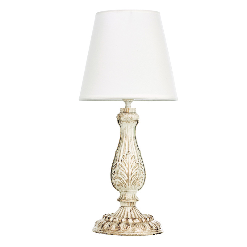 Πρόκειται για ένα μεταλλικό επιτραπέζιο φωτιστικό σε απόχρωση μπεζ πατίνας. Η ιδιαίτερη κλασσική του σχεδίαση συμπληρώνεται από το λευκό υφασμάτινο καπέλο.