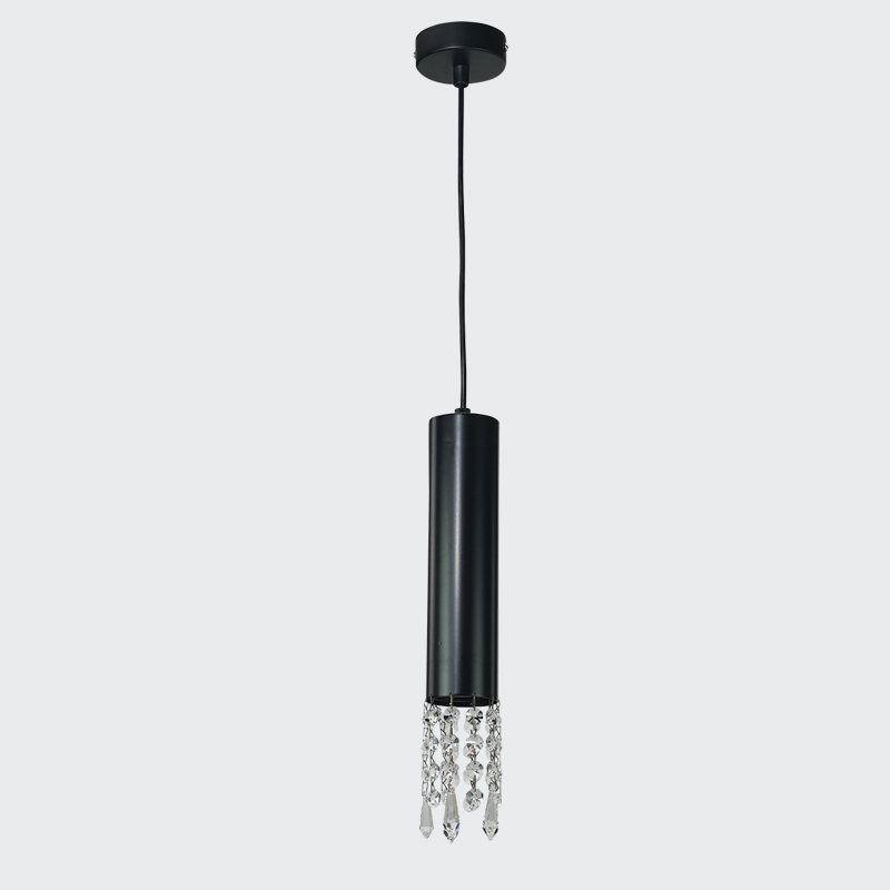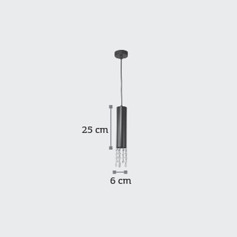 Πρόκειται για ένα μαύρο μεταλλικό κρεμαστό φωτιστικό κυλινδρικής σχεδίασης. Τα διάφανα κρύσταλλα στο τελείωμά του του δίνουν λάμψη. Η ανάρτησή του είναι ρυθμιζόμενη ώστε να προσαρμόζεται στον κάθε χώρο. Μπορεί να σταθεί είτε ως μονάδα, είτε δύο ή τρία μαζί σε ράγα ή ροζέτα.