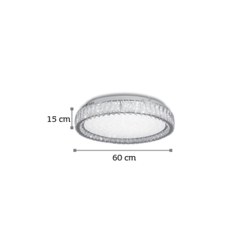 Πρόκειται για ένα χρώμιο μεταλλικό φωτιστικό οροφής κυκλικής σχεδίασης. Τα κρύσταλλα προσθέτουν λάμψη και αντανακλούν τον φωτισμό φυσικού χρώματος.