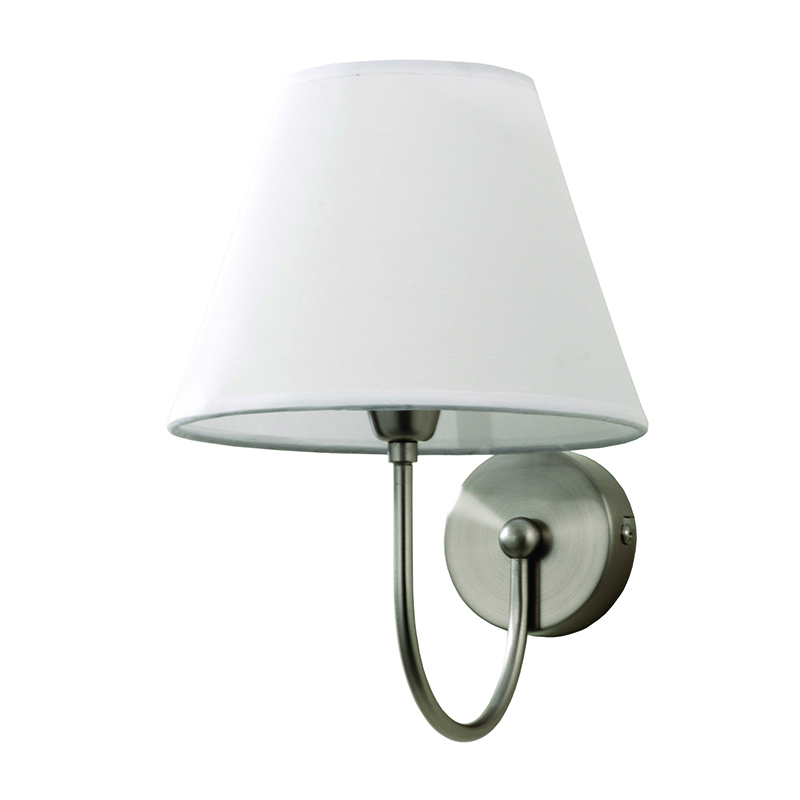 Πρόκειται για ένα επιτοίχιο μεταλλικό φωτιστικό σε νίκελ ματ απόχρωση και μίνιμαλ σχεδίαση. Το υφασμάτινο λευκό καπέλο συμπληρώνει την εικόνα του δίνοντας έναν πιο απαλό φωτισμό.