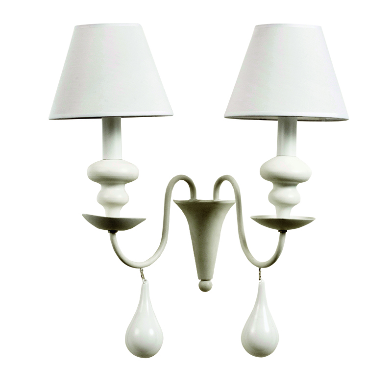 Πρόκειται για ένα λευκό μεταλλικό επιτοίχιο φωτιστικό με δύο λαμπτήρες. Την ιδιαίτερη σχεδίασή του συμπληρώνουν τα λευκά υφασμάτινα καπέλα που καλύπτουν τους λαμπτήρες αλλά και οι λευκές γυάλινες σταγόνες που κρέμονται από τους βραχίονές του.