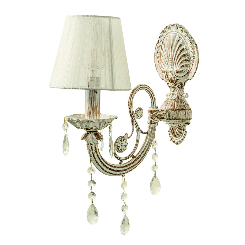 Πρόκειται για ένα μεταλλικό επιτοίχιο φωτιστικό σε απόχρωση μπεζ πατίνας. Τα κρύσταλλα δίνουν μια επιπλέον λάμψη, αλλά μπορούν και να αφαιρεθούν. Διατίθεται και λευκό υφασμάτινο καπέλα για πιο απαλό φωτισμό το οποίο θα πρέπει να ζητηθεί επιπλέον.