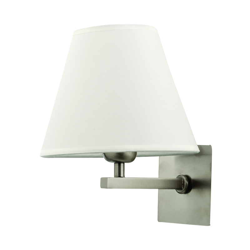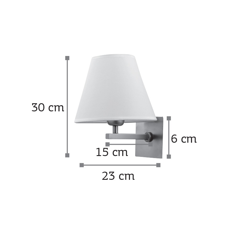 Πρόκειται για ένα επιτοίχιο μεταλλικό φωτιστικό σε νίκελ ματ απόχρωση και μίνιμαλ σχεδίαση. Το υφασμάτινο λευκό καπέλο συμπληρώνει την εικόνα του δίνοντας έναν πιο απαλό φωτισμό.