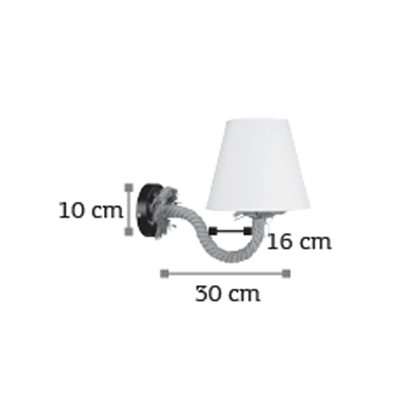 Πρόκειται για ένα επιτοίχιο φωτιστικό κατασκευασμένο από καφέ σχοινί. Η βάση του είναι από λευκό μέταλλο, καθιστώντας το ουδέτερο και εύκολη επιλογή για ποικίλους εσωτερικούς χώρους. Το υφασμάτινο καπέλο συμπληρώνει το φωτιστικό αυτό, δίνοντας του ένα ρομαντικό ύφος.