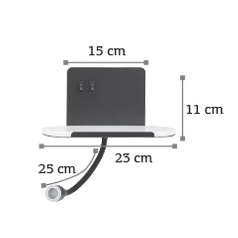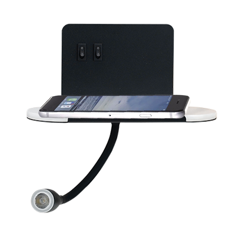 Πρόκειται για ένα μεταλλικό μαύρο επιτοίχιο φωτιστικό. Στο μπροστινό του μέρος υπάρχουν δύο διακριτικά διακοπτάκια. Το ένα αντιστοιχεί στο φως που υπάρχει στο μπροστινό μέρος όπου είναι κινούμενο και το άλλο στον διακριτικό περιμετρικό φωτισμό στο πίσω μέρος του. Και οι δύο φωτισμοί είναι led θερμής απόχρωσης. Αυτό που ενισχύει την ιδιαιτερότητά του είναι τόσο η θύρα usb που είναι ενσωματωμένη όσο και η δυνατότητα φόρτισης του κινητού τηλεφώνου χωρίς καλώδιο, απλώς ακουμπώντας το στην οριζόντια βάση!