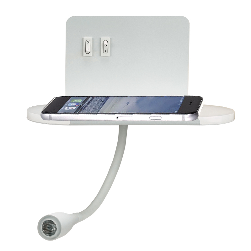Πρόκειται για ένα μεταλλικό λευκό επιτοίχιο φωτιστικό. Στο μπροστινό του μέρος υπάρχουν δύο διακριτικά διακοπτάκια. Το ένα αντιστοιχεί στο φως που υπάρχει στο μπροστινό μέρος όπου είναι κινούμενο και το άλλο στον διακριτικό περιμετρικό φωτισμό στο πίσω μέρος του. Και οι δύο φωτισμοί είναι led θερμής απόχρωσης. Αυτό που ενισχύει την ιδιαιτερότητά του είναι τόσο η θύρα usb που είναι ενσωματωμένη όσο και η δυνατότητα φόρτισης του κινητού τηλεφώνου χωρίς καλώδιο, απλώς ακουμπώντας το στην οριζόντια βάση!