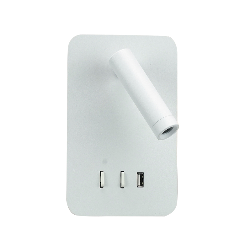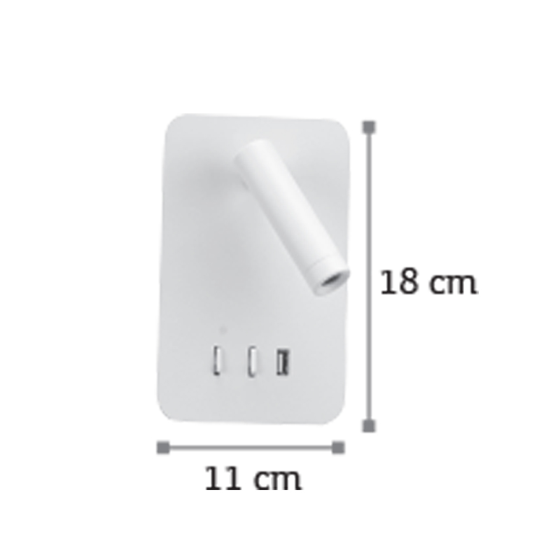 Πρόκειται για ένα μεταλλικό λευκό επιτοίχιο φωτιστικό. Στο μπροστινό του μέρος υπάρχουν δύο διακριτικά διακοπτάκια. Το ένα αντιστοιχεί στο φως που υπάρχει στο μπροστινό μέρος και το άλλο στον διακριτικό περιμετρικό φωτισμό στο πίσω μέρος του. Και οι δύο φωτισμοί είναι led θερμής απόχρωσης. Αυτό που ενισχύει την ιδιαιτερότητά του είναι η θύρα usb που είναι ενσωματωμένη και δίνει τη δυνατότητα φόρτισης του κινητού τηλεφώνου!