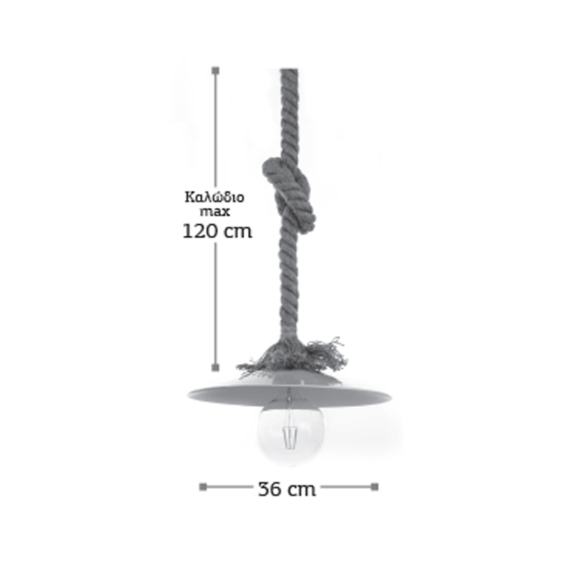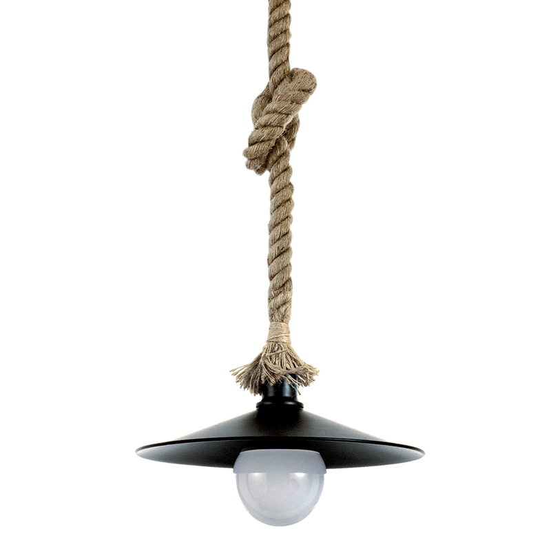 Πρόκειται για ένα κρεμαστό φωτιστικό με συνδυασμό καφέ σχοινιού και μαύρου μετάλλου. Η ανάρτηση από σχοινί μπορεί να ρυθμιστεί για να προσαρμοστεί στον κάθε χώρο.