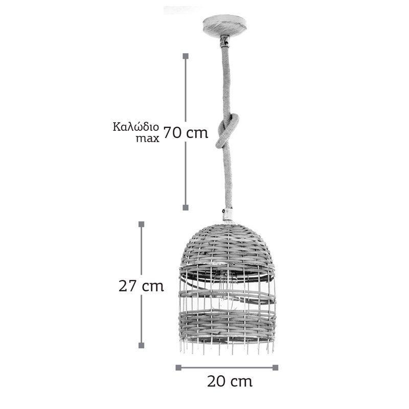 Ένα κρεμαστό φωτιστικό κατασκευασμένο από ρατάν κατάλληλο για ποικίλους εσωτερικούς χώρους. Αποτελεί την ιδανική επιλογή για όποιον επιθυμεί μια πιο χαλαρή διάθεση στον χώρο του. Το διακριτικό λευκό μέταλλο προσδίδει ένα ιδιαίτερο design. Η ανάρτηση προσαρμόζεται στο ύψος του κάθε χώρου.