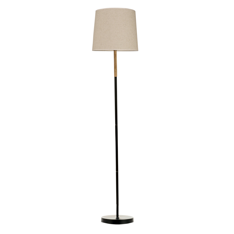 Επιδαπέδιο φωτιστικό από μαύρο μέταλλο με διακριτική ύπαρξη ξύλου στο πάνω μέρος του. Το υφασμάτινο καπέλο στην μπεζ απόχρωση δίνει ένα ρομαντικό ύφος και στο φωτιστικό και στον χώρο τοποθέτησής του.