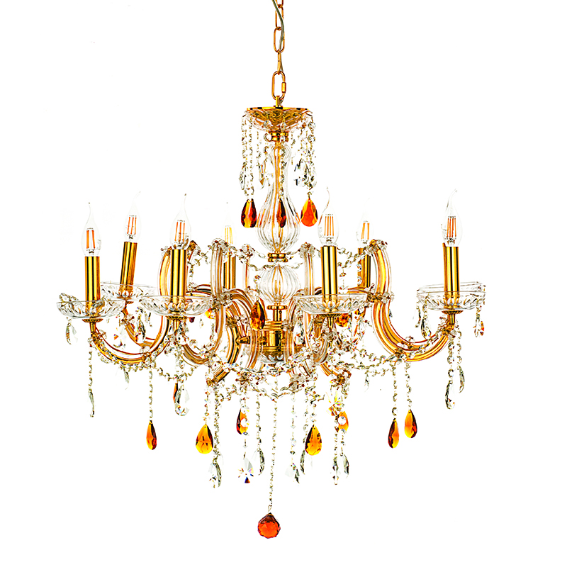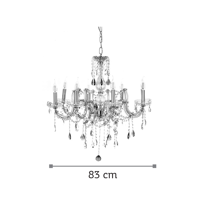 Πρόκειται για ένα κρεμαστό φωτιστικό με οχτώ λαμπτήρες. Το σώμα του αποτελείται από χρυσό μέταλλο που καλύπτεται από διάφανο γυαλί. Τα κρύσταλλα που το διακοσμούν είναι ένας συνδυασμός διάφανου και μελί. Μπορεί να επιλεχθεί και μόνο διάφανη ή μόνο μέλι διακόσμηση στο τελείωμα. Η μεταλλική ανάρτηση είναι ρυθμιζόμενη ώστε να προσαρμόζεται στον κάθε χώρο. Διατίθεται και η επιλογή του υφασμάτινου καπέλου το οποίο πρέπει να ζητηθεί επιπλέον.