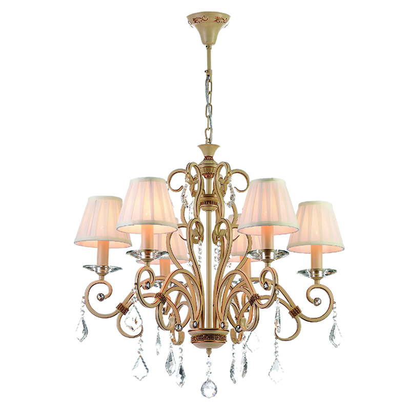 Πρόκειται για ένα μπεζ μεταλλικό κρεμαστό φωτιστικό με έξι λαμπτήρες και διακριτική ύπαρξη κρυστάλλων. Τα μπεζ υφασμάτινα καπέλα που καλύπτουν τους λαμπτήρες δίνουν έναν απαλό φωτισμό στον χώρο. Η μεταλλική ανάρτηση είναι ρυθμιζόμενη ώστε να προσαρμοστεί στον κάθε χώρο.