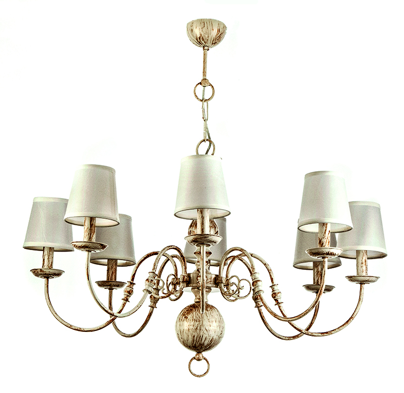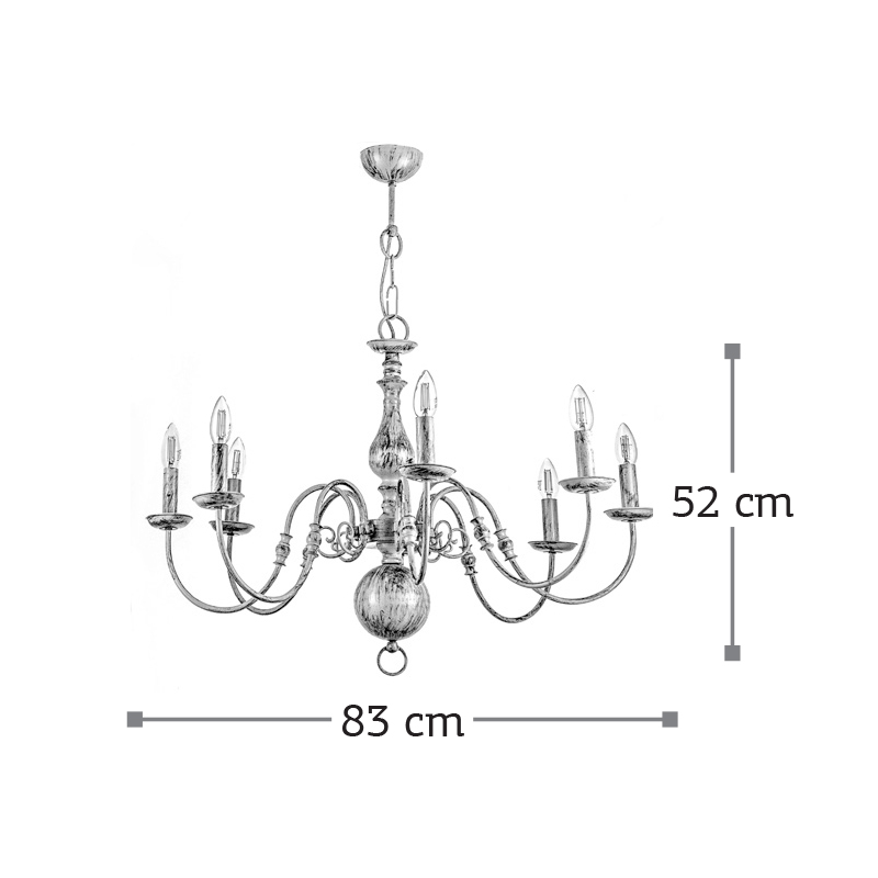 Πρόκειται για ένα κρεμαστό φωτιστικό από μέταλλο σε λευκή πατίνα με οχτώ λαμπτήρες. Κατάλληλο για διακόσμηση κλασσικών εσωτερικών χώρων. Η μεταλλική ανάρτηση είναι ρυθμιζόμενη για να προσαρμοστεί στον κάθε χώρο. Διατίθεται και λευκό υφασμάτινο καπέλο για πιο απαλό φωτισμό το οποίο θα πρέπει να ζητηθεί επιπλέον.