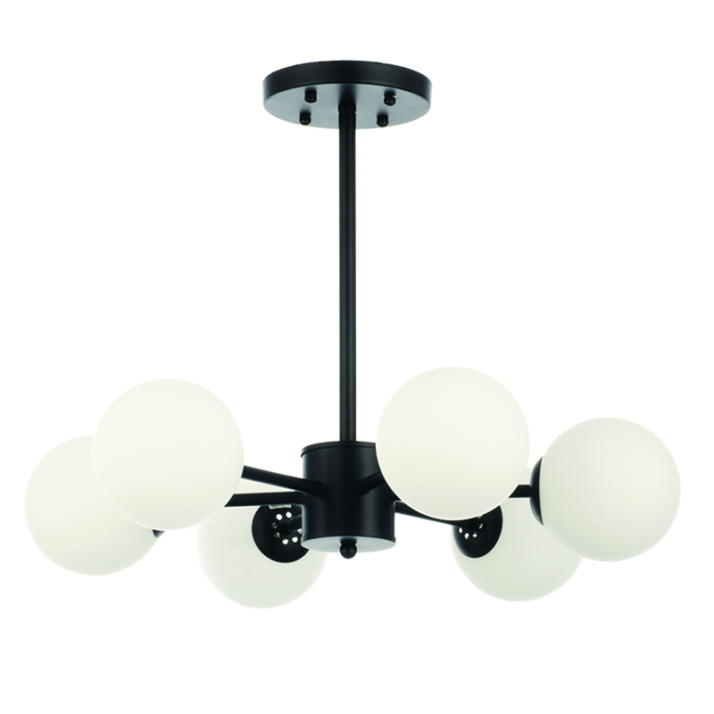Πρόκειται για ένα μαύρο μεταλλικό φωτιστικό με λευκή οπαλίνα στο τελείωμα και έξι λαμπτήρες. Η μίνιμαλ σχεδίασή του το τοποθετεί ιδανικά σε οποιονδήποτε μοντέρνο εσωτερικό χώρο, ακόμα και αν είναι χαμηλοτάβανος.