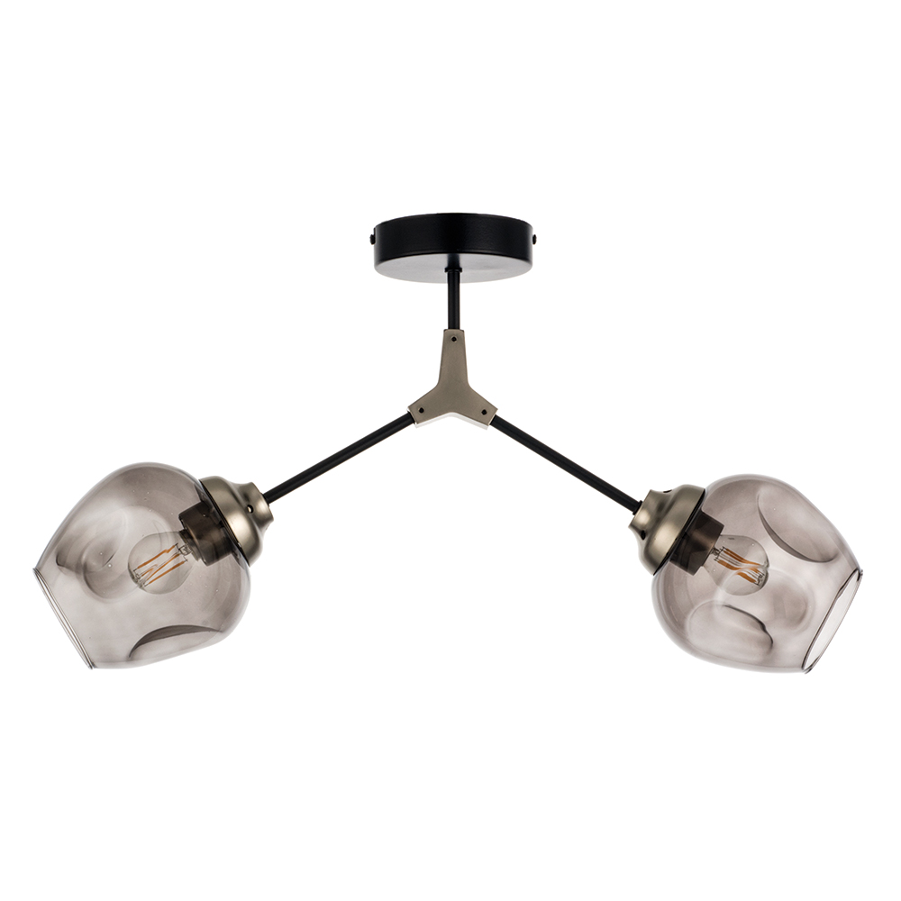 Πρόκειται για ένα μεταλλικό κρεμαστό φωτιστικό μαύρου χρώματος με νίκελ διακριτικά στοιχεία και δύο λαμπτήρες. Το γυαλί είναι φιμέ, αλλά υπάρχει και η επιλογή του διάφανου χρώματος. Η μίνιμαλ σχεδίασή του το τοποθετεί σε οποιονδήποτε μοντέρνο εσωτερικό χώρο.
