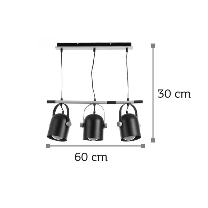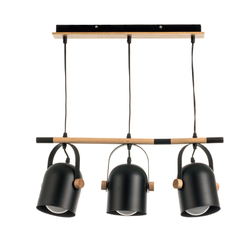 Κρεμαστό φωτιστικό κατασκευασμένο από μαύρο μέταλλο και λεπτομέρειες ξύλου. Το μίνιμαλ design του το τοποθετεί σε οποιονδήποτε μοντέρνο εσωτερικό χώρο. Τα μεταλλικά καπάκια κινούνται για να προσαρμοστούν ιδανικά στον κάθε χώρο. Τα καλώδια το συγκρατούν διακριτικά επιτρέποντας ταυτόχρονα τη ρύθμιση του ύψους.