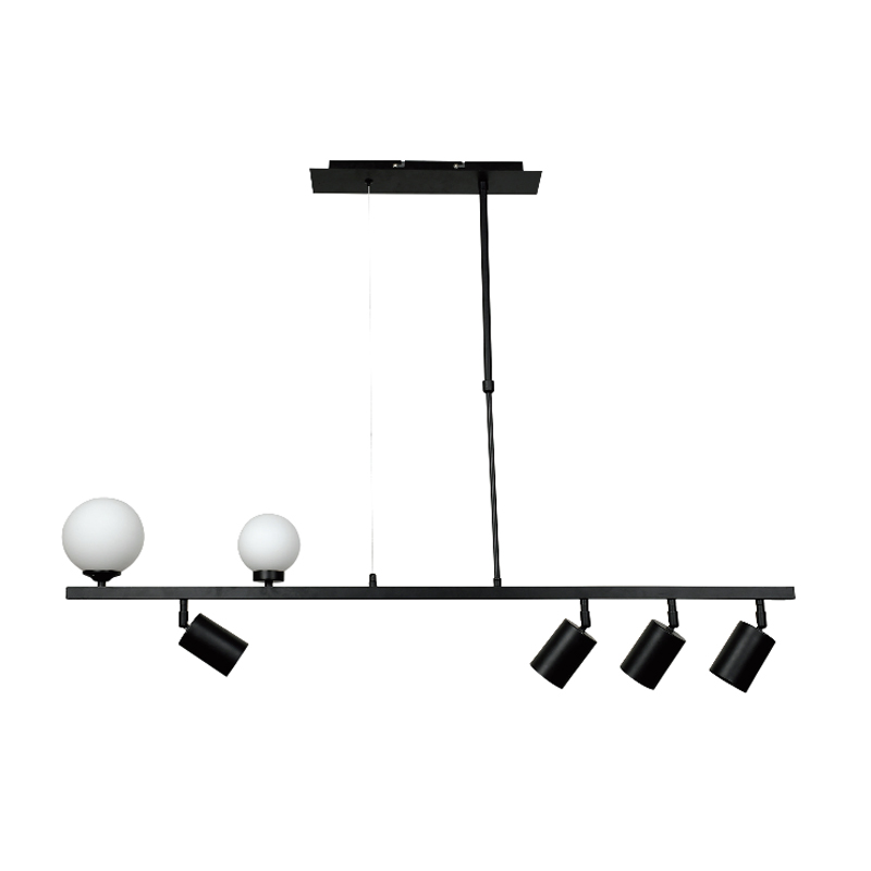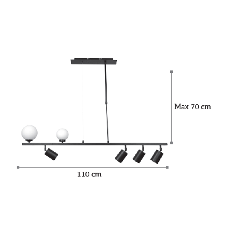 Πρόκειται για ένα κρεμαστό μεταλλικό φωτιστικό μαύρου χρώματος. Ο φωτισμός του είναι συνδυαστικός, αποτελούμενος από δύο λαμπτήρες διάχυσης καλυπτόμενους από λευκή οπαλίνα και τέσσερις λαμπτήρες πιο εστιακούς καλυπτόμενους από μεταλλικό καπάκι. Η ανάρτηση είναι ρυθμιζόμενη ώστε να προσαρμοστεί στον χώρο τοποθέτησής του.