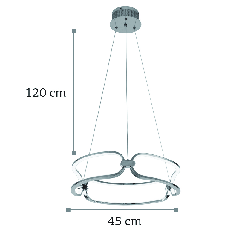 Πρόκειται για ένα χρώμιο κρεμαστό φωτιστικό κατασκευασμένο από αλουμίνιο. Στο εσωτερικό του υπάρχει λευκή ακρυλική επιφάνεια που καλύπτει τον led φωτισμό απόχρωσης φυσικού χρώματος. Η ανάρτησή του είναι ρυθμιζόμενη ώστε να προσαρμοστεί σε κάθε χώρο.