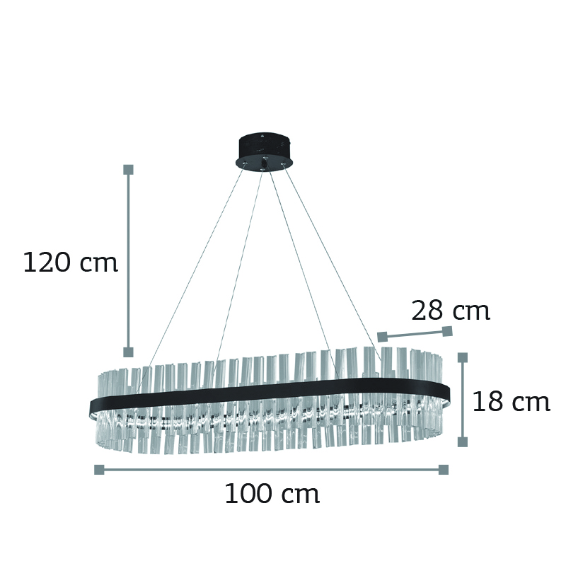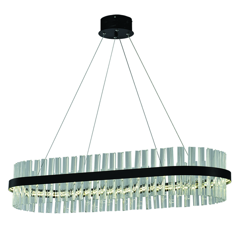 Πρόκειται για ένα μαύρο κρεμαστό φωτιστικό κατασκευασμένο από αλουμίνιο. Τα κρύσταλλα προσθέτουν λάμψη και αντανακλούν τον φωτισμό φυσικού χρώματος. Η ανάρτησή του είναι ρυθμιζόμενη για να προσαρμόζεται στον κάθε χώρο.