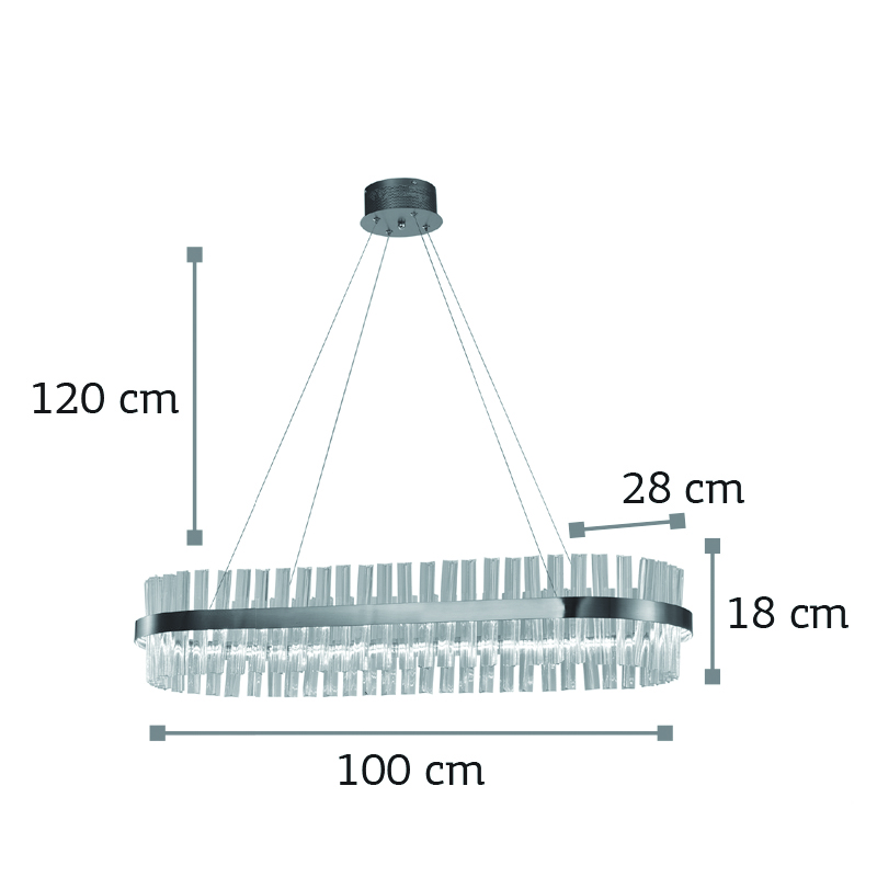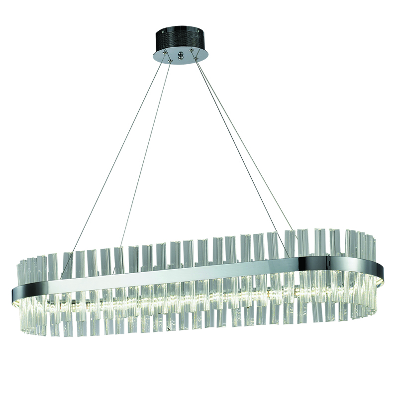 Πρόκειται για ένα χρώμιο κρεμαστό φωτιστικό κατασκευασμένο από αλουμίνιο. Τα κρύσταλλα προσθέτουν λάμψη και αντανακλούν τον φωτισμό φυσικού χρώματος. Η ανάρτησή του είναι ρυθμιζόμενη για να προσαρμόζεται στον κάθε χώρο.