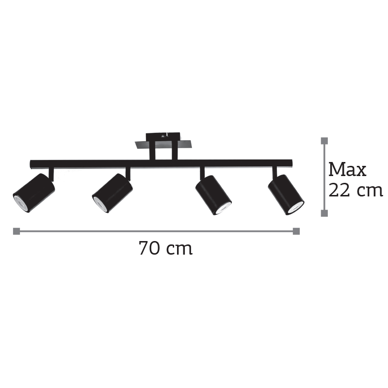 Πρόκειται για ένα μεταλλικό σποτ σε μαύρη απόχρωση με τέσσερις λαμπτήρες. Το μεταλλικό καπάκι μπροστινό του μέρος κινείται προς οποιαδήποτε κατεύθυνση. Τοποθετείται και στην οροφή και στον τοίχο!