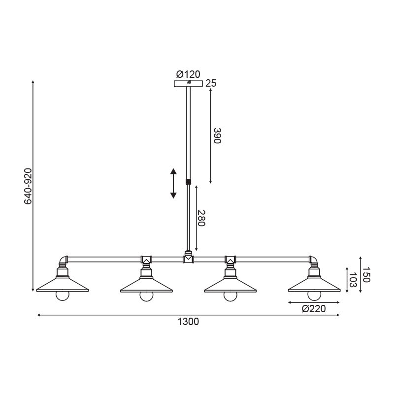 ^ΚΡΕΜΑΣΤΟ Φ/Σ 4ΧΕ27 ΜΑΥΡΟ+ΧΡΥΣΟ ΜΕΤΑΛΛΙΚΟ 130Χ22ΧH92CM PIPE
