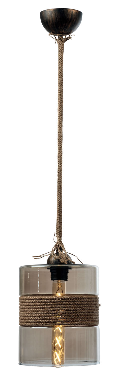Φωτιστικό μονόφωτο γυάλινο σε χρώμα φιμέ τυλιγμένο με φυσικό σχοινί και ανάρτηση σχοινί Ε27 Φ20